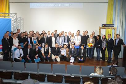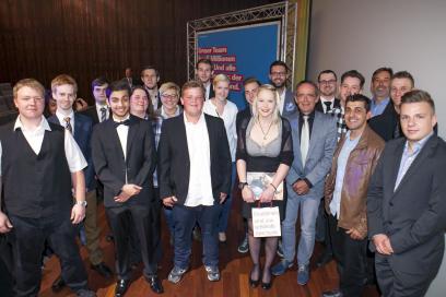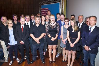 Direkt im Anschluss durften dann aber auch die anderen Absolventen auf die Bühne und glücklich Ihren Gesellenbrief und die Glückwünsche der Prüfungskommission entgegennehmen, bevor sie stolz den Moment mit einem gemeinsamen Gruppenfoto festhielten.