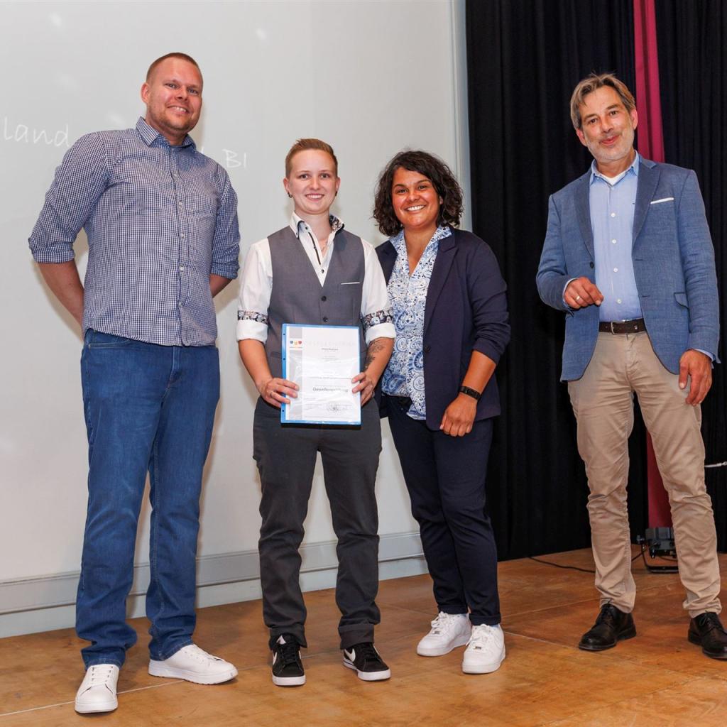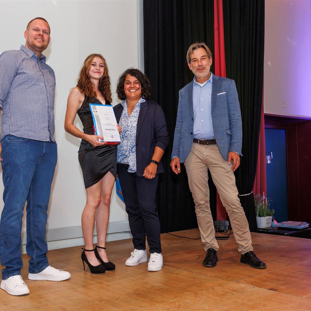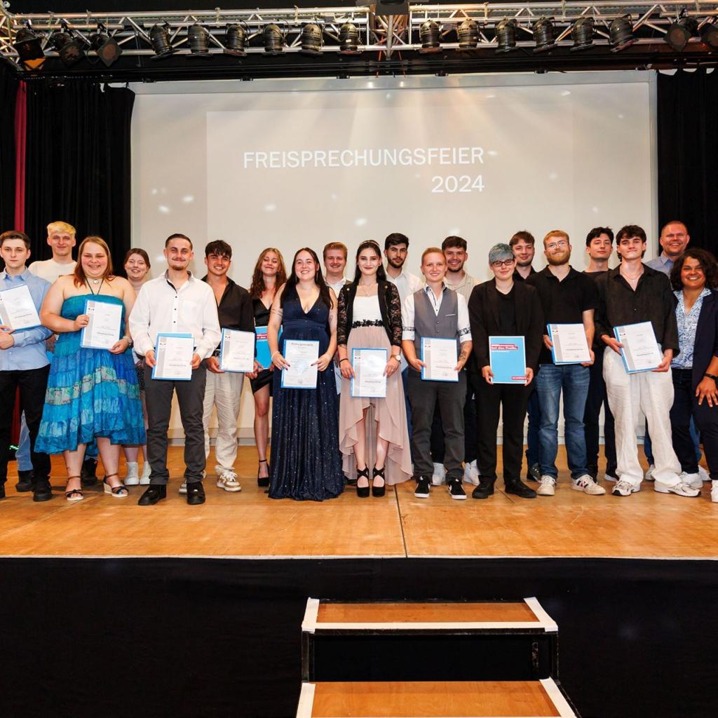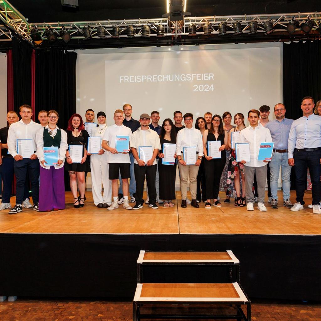 Direkt im Anschluss betraten die frischgebackenen Absolventen voller Stolz die Bühne, um ihre wohlverdienten Gesellenbriefe und die herzlichen Glückwünsche der Prüfungskommissionen entgegenzunehmen. Den emotionalen Moment ließen sie nicht ungenutzt und hielten ihn mit einem gemeinsamen Gruppenfoto fest.