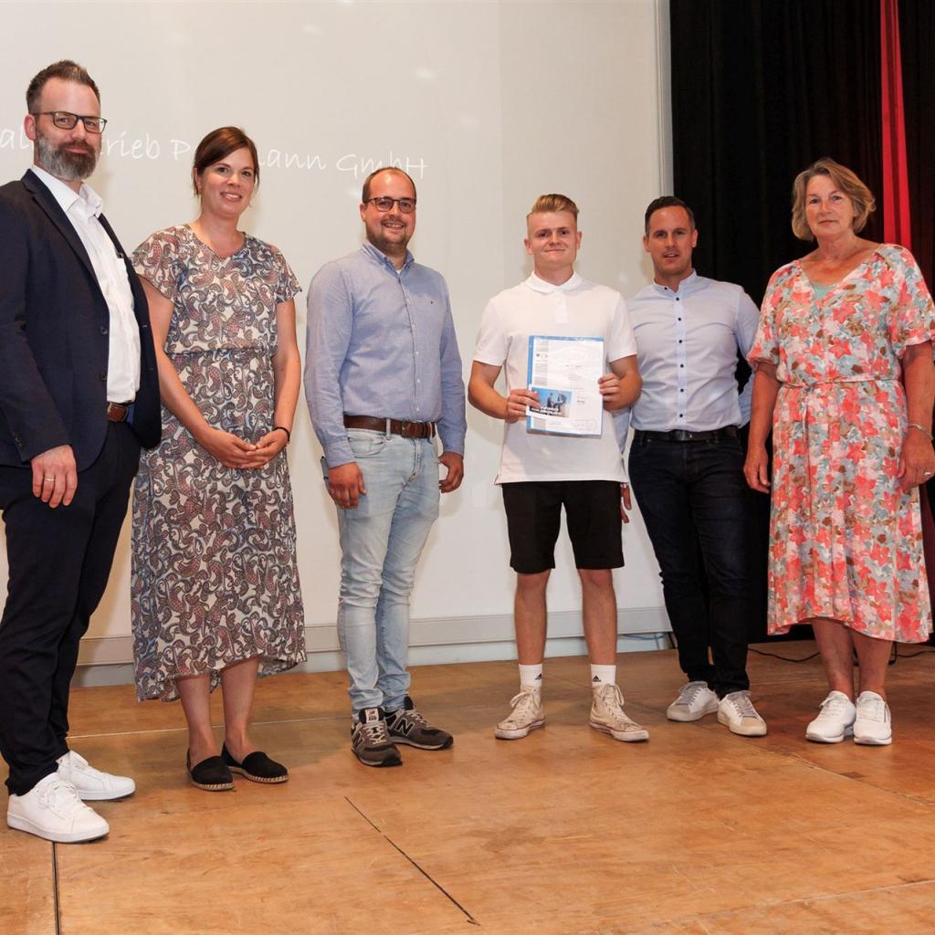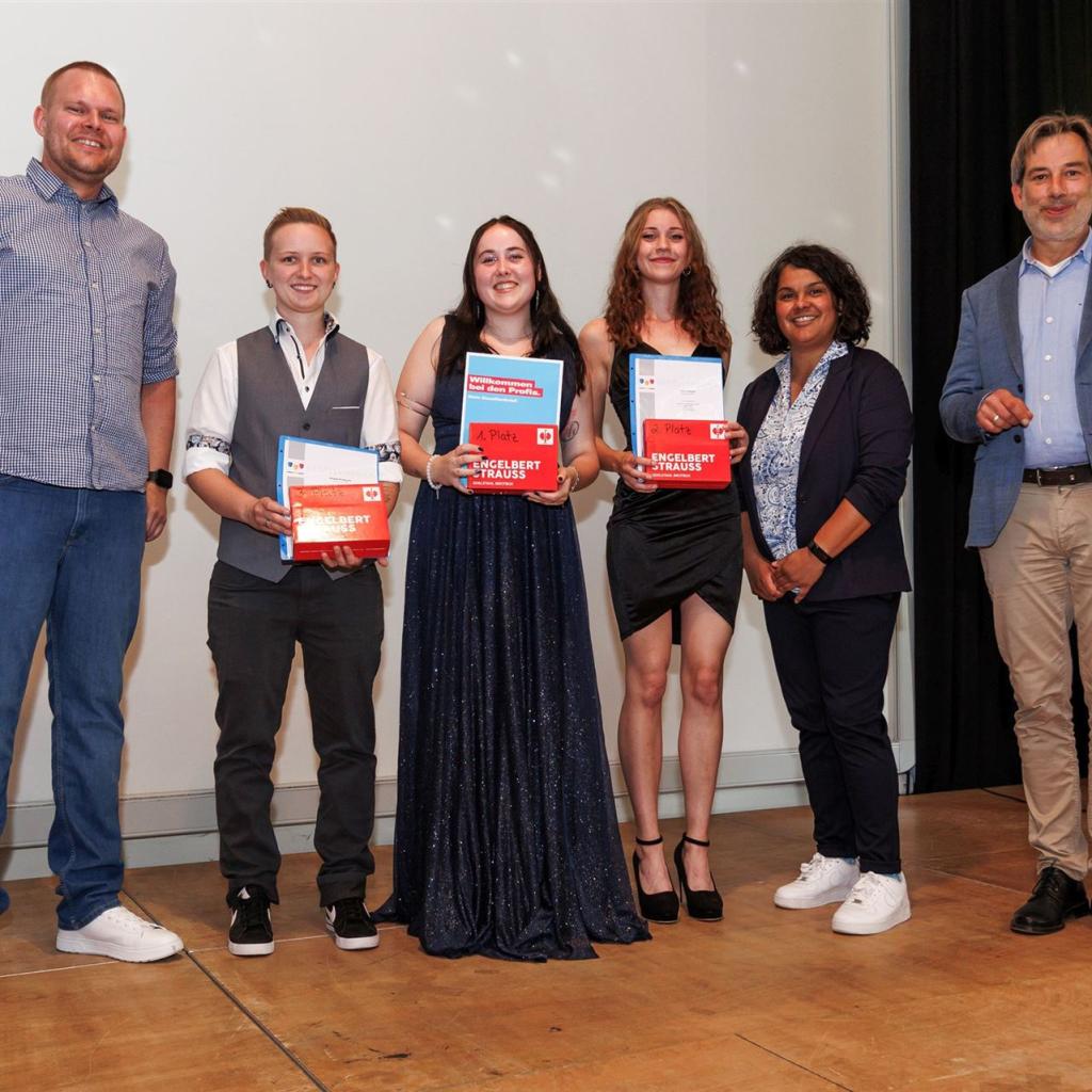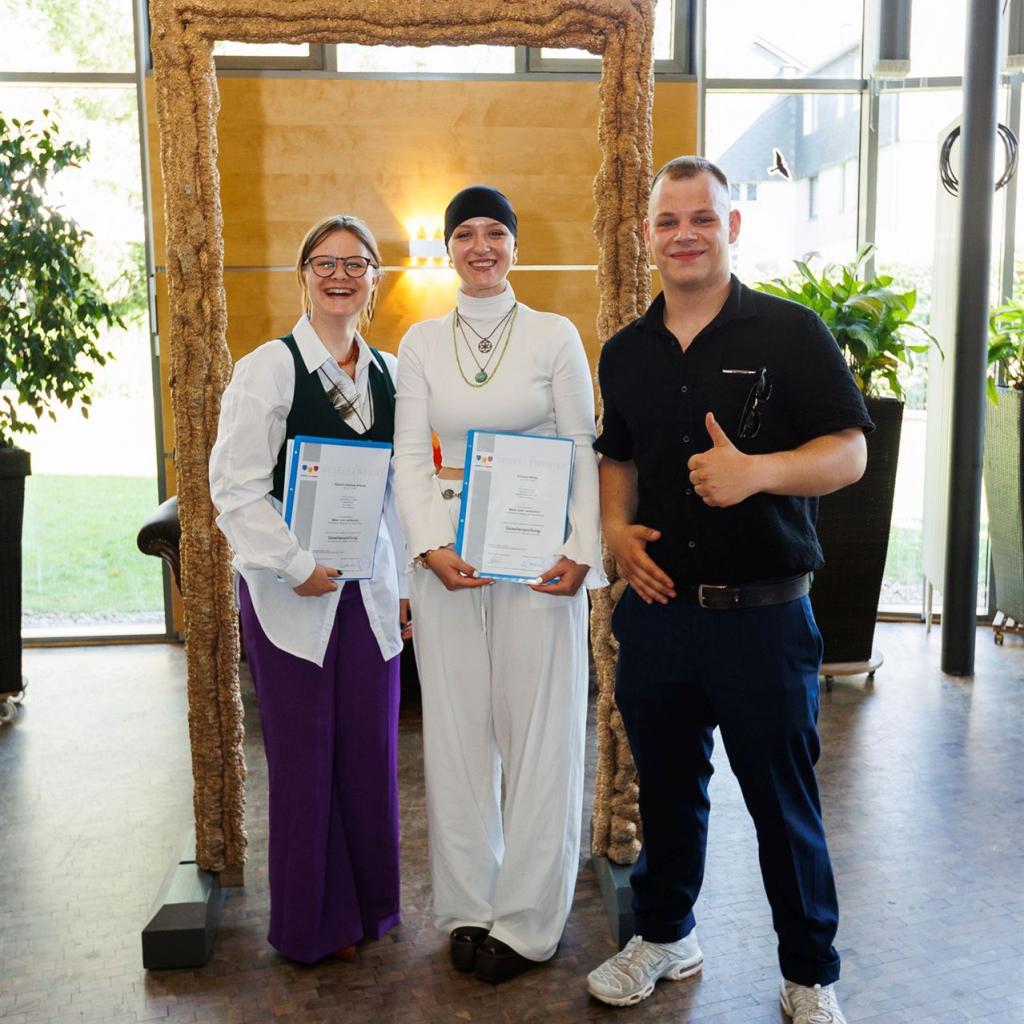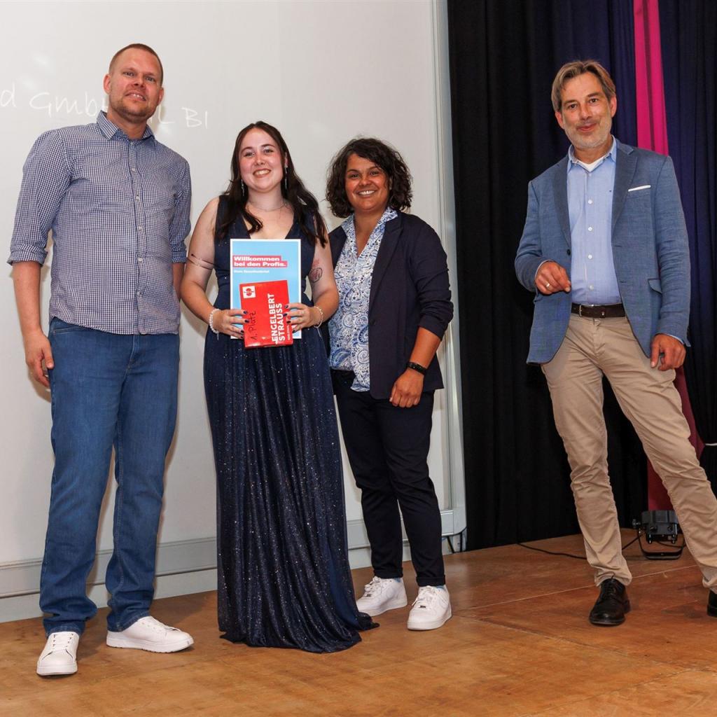 Direkt im Anschluss betraten die frischgebackenen Absolventen voller Stolz die Bühne, um ihre wohlverdienten Gesellenbriefe und die herzlichen Glückwünsche der Prüfungskommissionen entgegenzunehmen. Den emotionalen Moment ließen sie nicht ungenutzt und hielten ihn mit einem gemeinsamen Gruppenfoto fest.