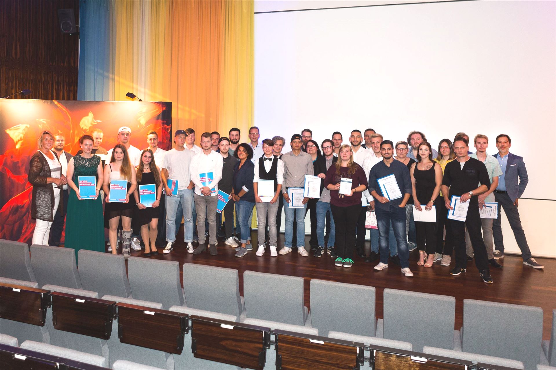 Direkt im Anschluss durften dann aber auch die restlichen Absolventen, Maler und Fahrzeuglackierer auf ihre verdiente Bühne und glücklich ihren Gesellenbrief und die Glückwünsche der Prüfungskommissionen entgegennehmen, bevor sie stolz den Moment mit einem gemeinsamen Gruppenfoto festhalten ließen.