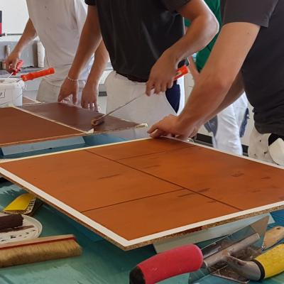 | Handlungsfelder 1 - 4 Konzepterstellung für eine Raumsituation, Formale Gestaltung, Farbenlehre, Schriftkonstruktion, Vergoldung, Perspektivisches Zeichnen, Gestaltungstechniken, Konstruktion von Ornamenten, Wandgestaltung, Werbe- und Schriftgestaltung, Fahrzeuglackierung |